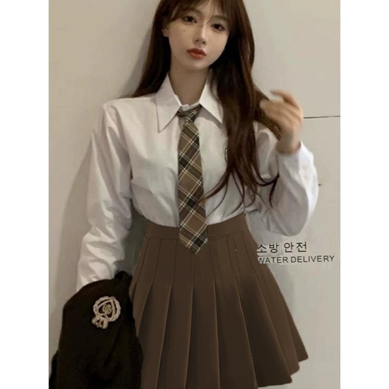 Seragam JK musim gugur kemeja lengan panjang niche, setelan rok kotak-kotak berlipat gaya preppy atasan anak perempuan panas