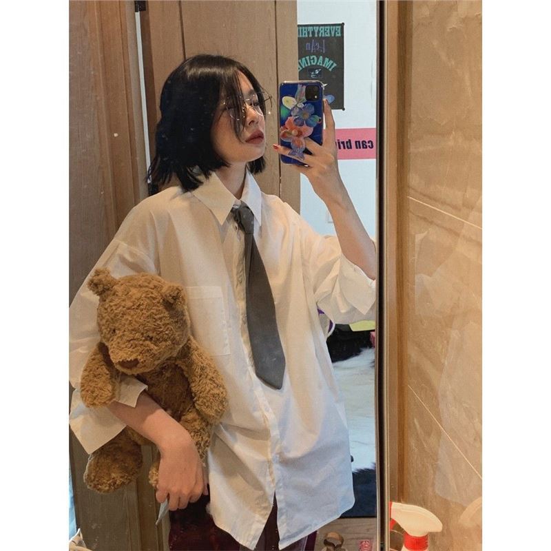 Kemeja Gaya Pacar Model Panjang Sedang Seragam JK Pakaian Luar Wanita Pakaian Musim Panas 2024 Kemeja Putih Kasual Longgar Versi Korea Baru