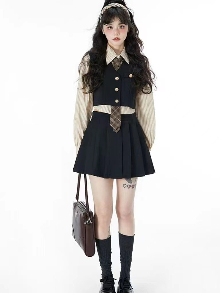 Setelan gaya kuliah wanita musim gugur dan musim dingin 2024 seragam gaya Korea baru jk rompi pendek pengurang usia rok kemeja setelan tiga potong