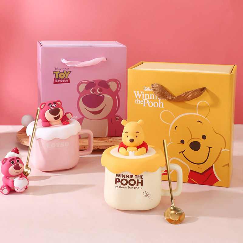 迪士尼草莓熊水杯卡通陶瓷杯套装礼盒高颜值带盖马克杯伴手礼包邮