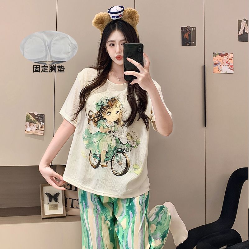 现货批发云朵棉自带胸垫睡衣女夏可爱学生甜美短袖长裤家居服套装