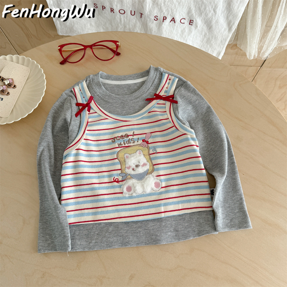 【粉红屋】女童森系条纹假两件打底衫新款儿童卡通猫咪长袖圆领