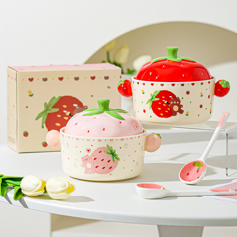 Mangkuk Mie Wanita Lucu Stroberi Kartun Mangkuk Mie Mie Keramik Mangkuk Telinga Ganda dengan Penutup Peralatan Makan Hadiah Set Mangkuk
