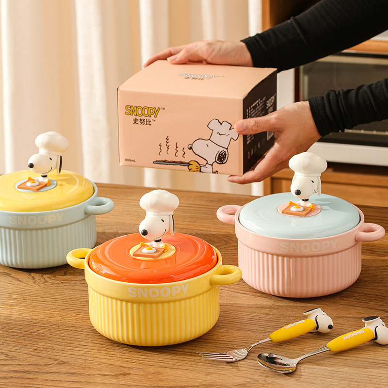 Snoopy mangkuk mie instan dengan tutup, perlengkapan makan rumah tangga lucu kartun binaural kapasitas besar