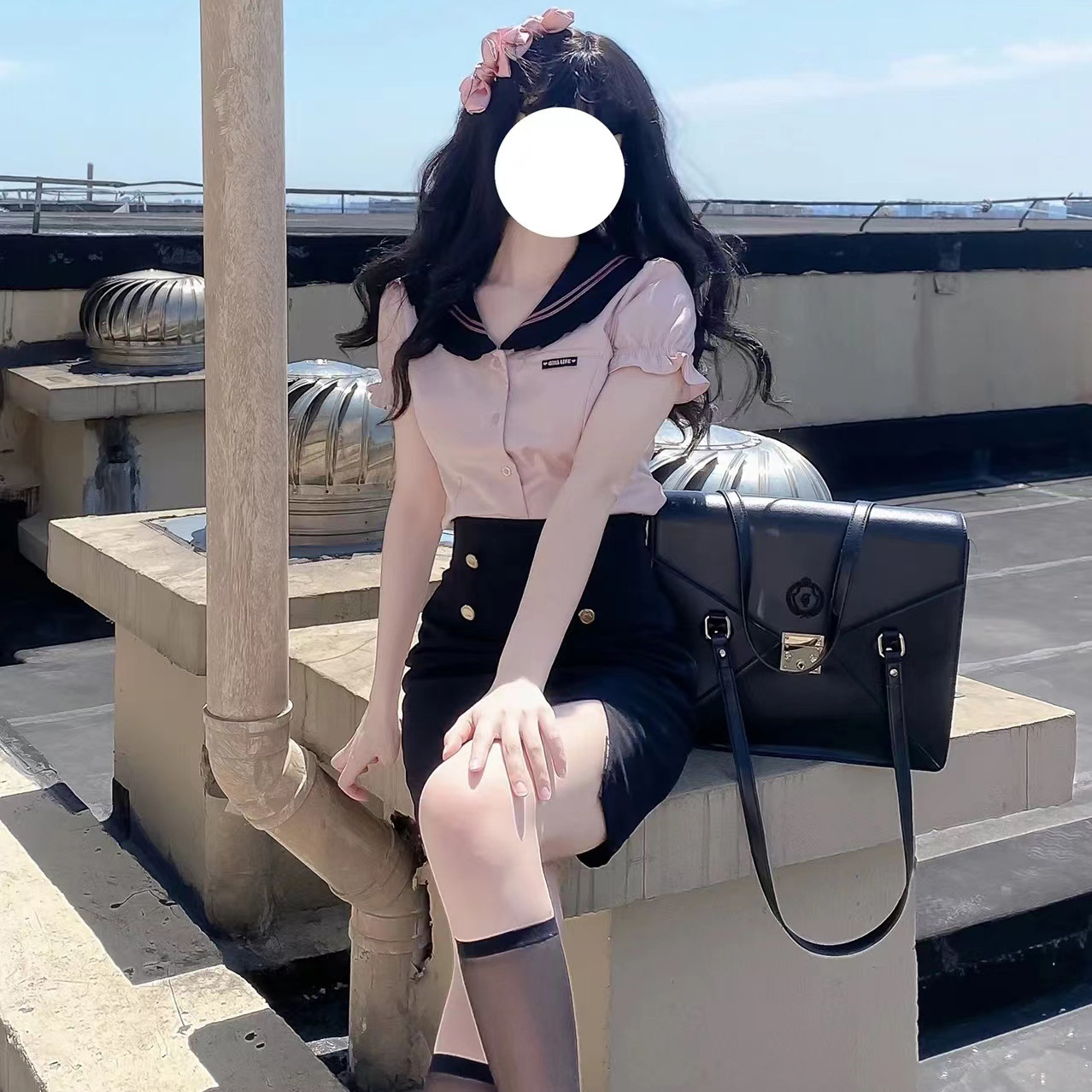 Setelan Seragam JK Gaya Perguruan Tinggi Jepang Pakaian Laut Musim Panas Wanita Baju Atasan Ketat Pinggang Tinggi Rok Setengah Badan Lipit Pinggang Tinggi Setelan Dua Potong