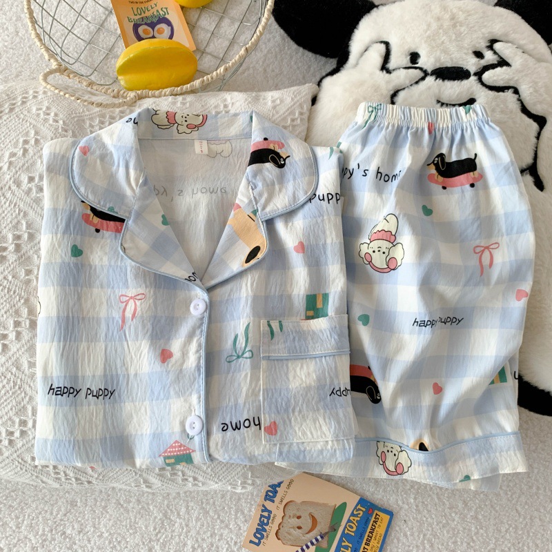 Baju Tidur Kartun Celana Pendek Lengan Pendek Katun Awan Musim Panas Wanita Pakaian Rumah Bisa Dipakai Luar Murid Lucu Model Tipis