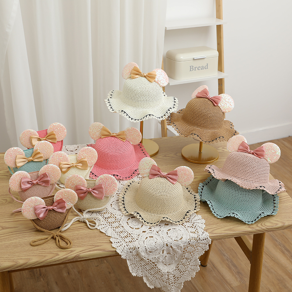 Topi jerami kartun anak-anak, topi pantai musim panas baru, tas selempang setelan topi matahari anyaman orang tua anak
