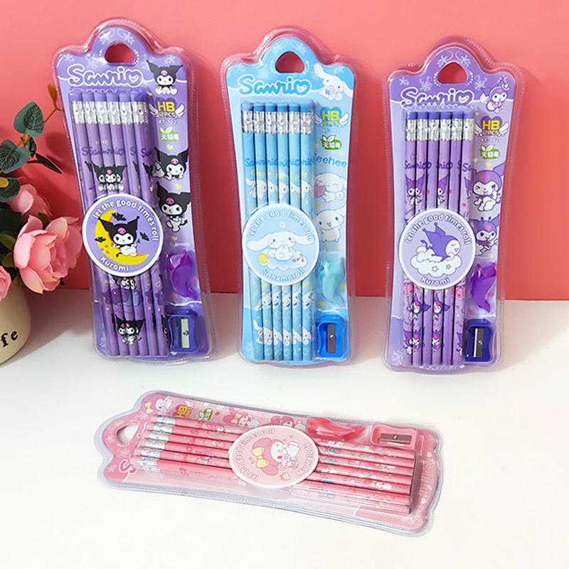 Sanrio setelan pensil kartun lucu 12 buah, dengan penghapus, kaligrafi siswa, latihan pensil dengan rautan pensil pemegang pena