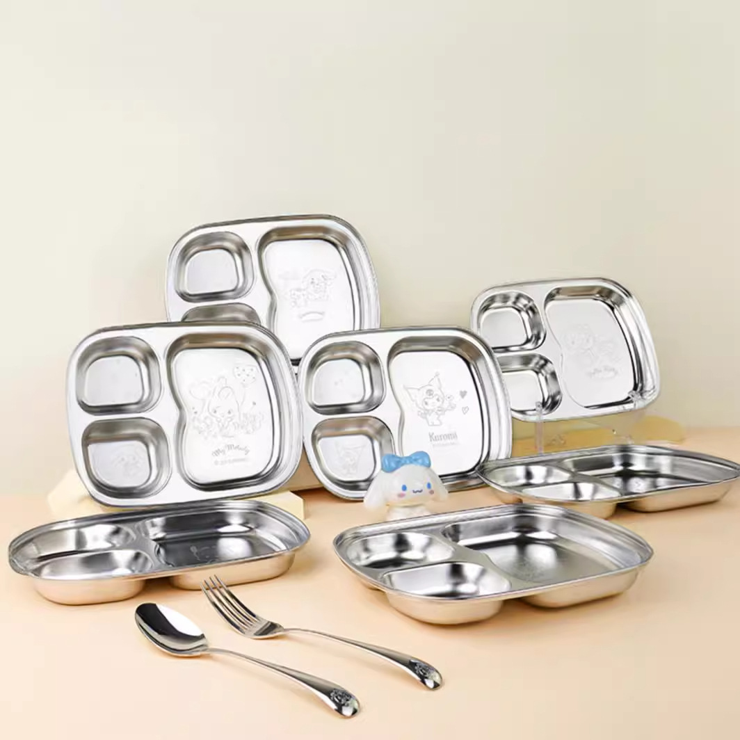 Piring makan siang anak-anak Sanrio dari baja tahan karat 304, tiga sekat, piring makanan cepat saji persegi, kotak makan siang tebal untuk pelajar, mangkuk JK