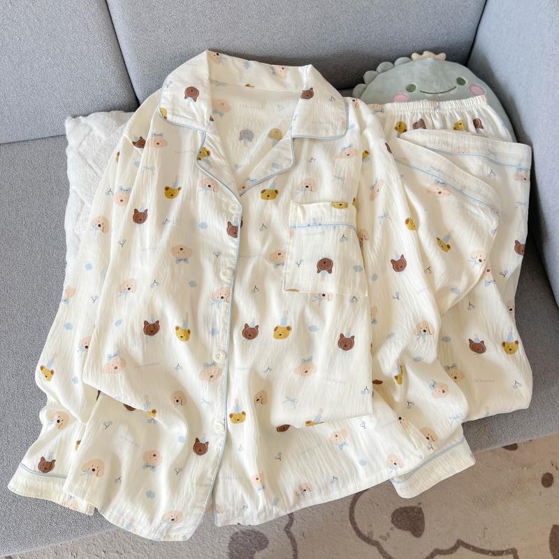 Piyama celana panjang musim panas untuk wanita, pakaian kardigan rumah kasual pelajar baru lucu kartun