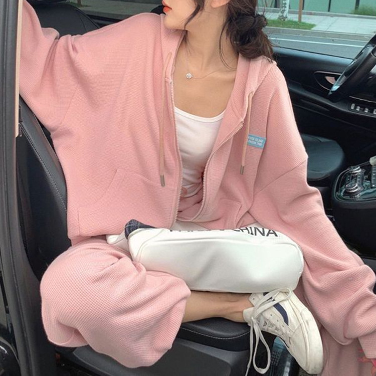 Waffle setelan olahraga sederhana wanita, dua potong sweater kasual modis longgar gaya Korea pelajar baru Musim Semi dan Gugur