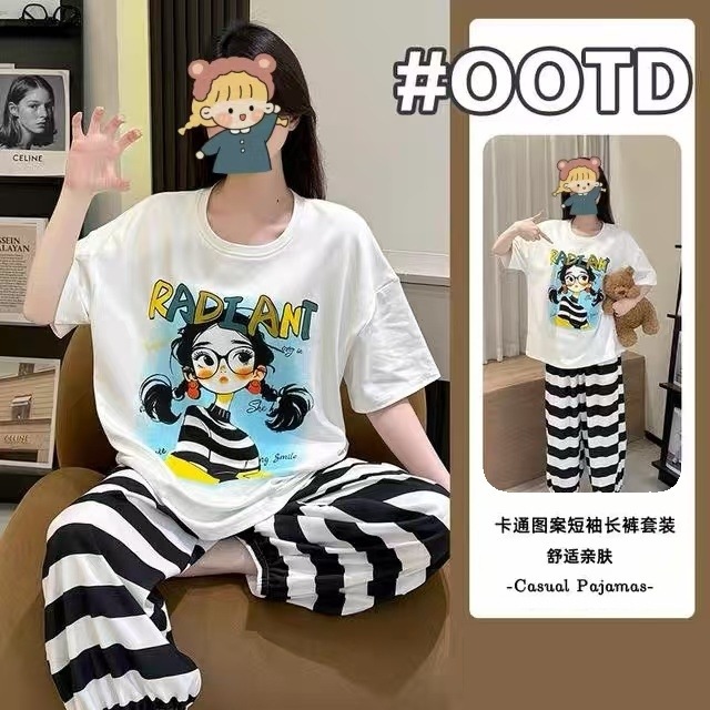2025年卡通条纹睡衣女生夏季短袖长裤韩版外穿家居服可爱学生套装
