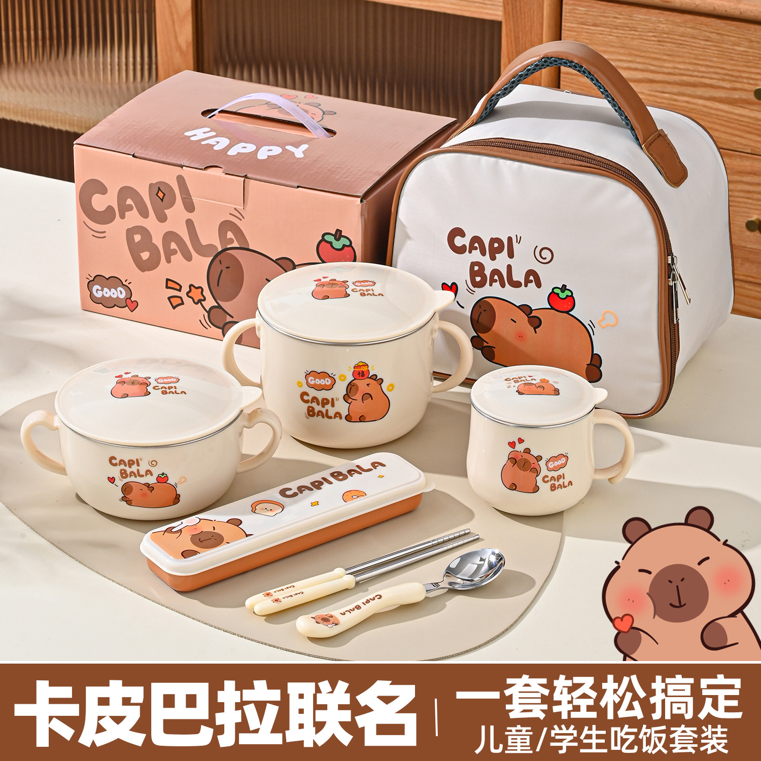 小学生双耳汤碗316不锈钢儿童碗防烫防摔带盖饭碗宝宝专用辅食碗