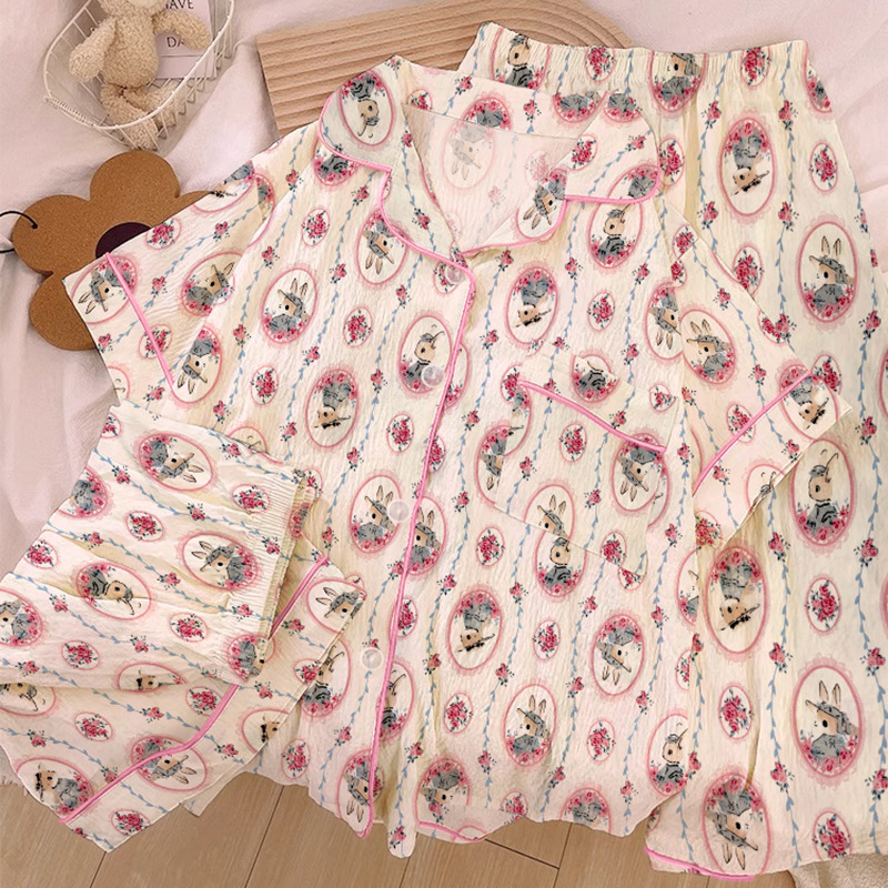 Lintas Batas Musim Semi Musim Panas Kapas Awan Manis Gaya Bunga Kelinci Cetak Tiga Potong Piyama Asrama Pelajar Grosir