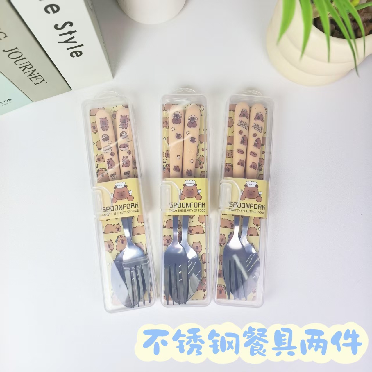 新款便携卡通410不锈钢餐具二件套卡皮巴拉叉子勺子套装学生叉勺