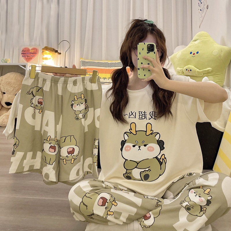 Baju Tidur Model Baru Musim Panas Celana Pendek Lengan Pendek Celana Panjang Tiga Potong Pakaian Rumah Pelajar Longgar Manis Setelan Instagram