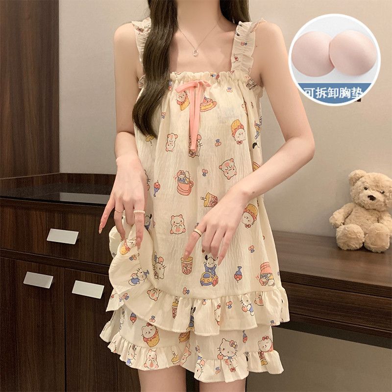 Baju Tidur Lintas Batas Musim Panas Wanita dengan Alas Dada Musim Panas Celana Pendek Katun Sling Manis Setelan Pakaian Rumah Pelajar Kartun Gaya Jepang