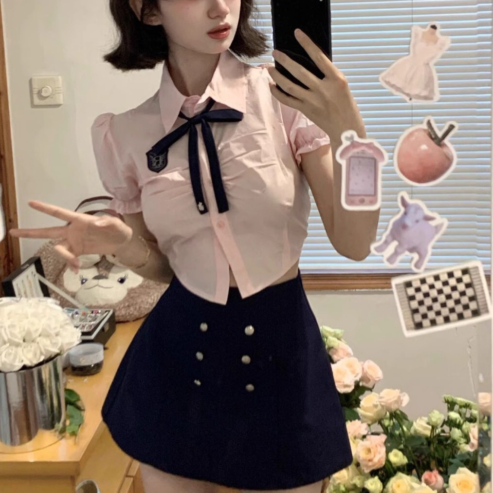 Kemeja Tubuh Kecil Set Dua Potong Gaya Sekolah Seragam JK Model Baru Musim Panas Atasan Wanita Rok Setengah Badan Terlihat Langsing Pinggang Pelangsing