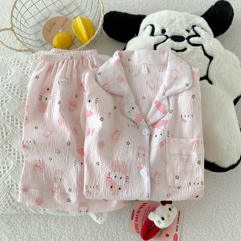 Set Pakaian Rumah Bisa Dipakai Luar Gadis Murid Murid Gadis Lucu Kartun Kapas Awan Model Piyama Celana Pendek Lengan Pendek Musim Panas Kucing KTO