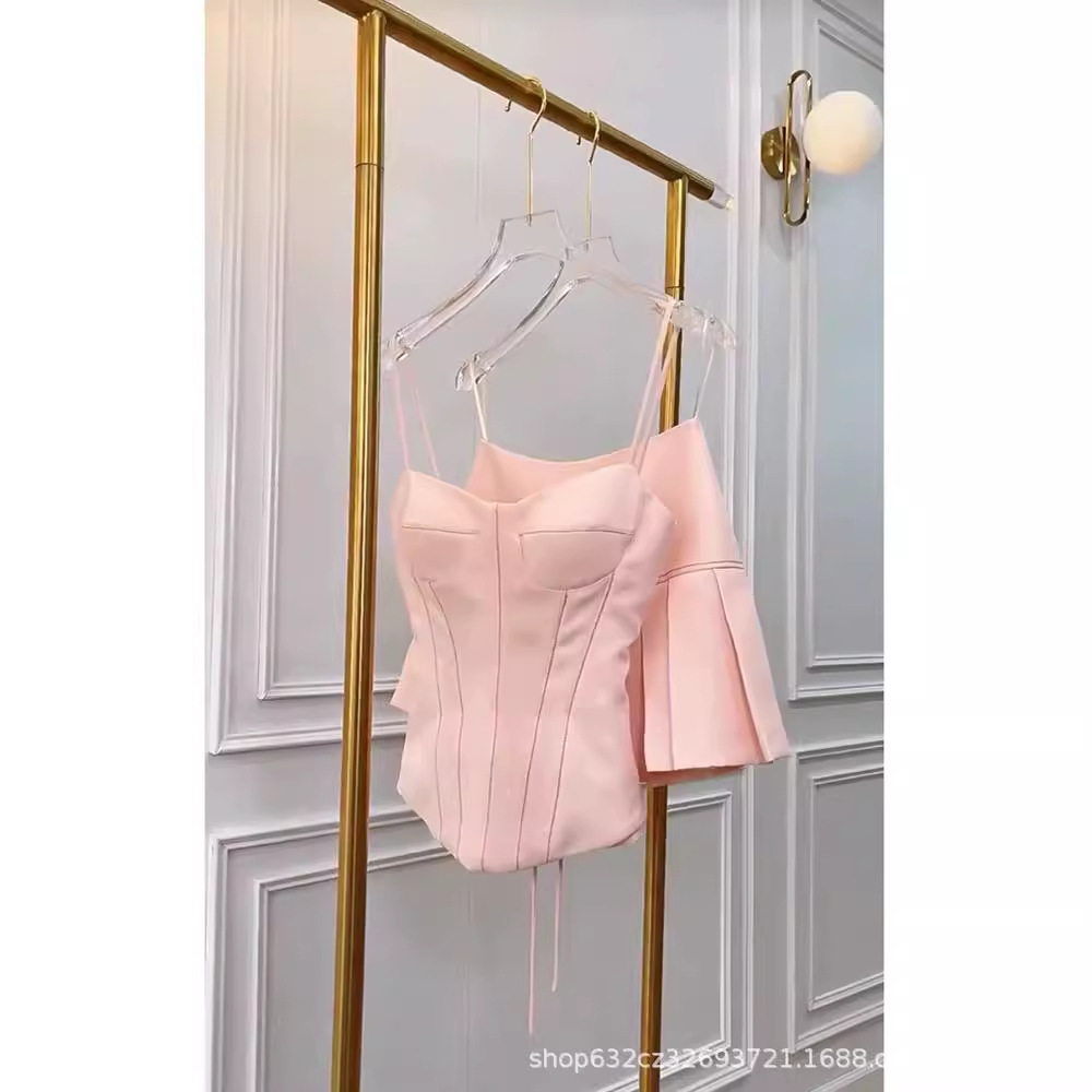 Setelan rok suspender cantik susu manis, setelan rok suspender merah muda untuk wanita tahun ini, setelan dua potong modis gaya Barat lembut populer netral