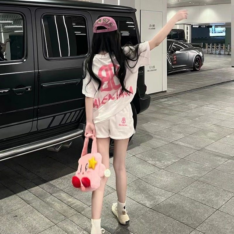 Setelan Olahraga Model Baru Musim Panas 2025 Pakaian Olahraga Pelajar Gadis Kasual Tipis Celana Pendek Cetak Gaya Barat Dua Potong