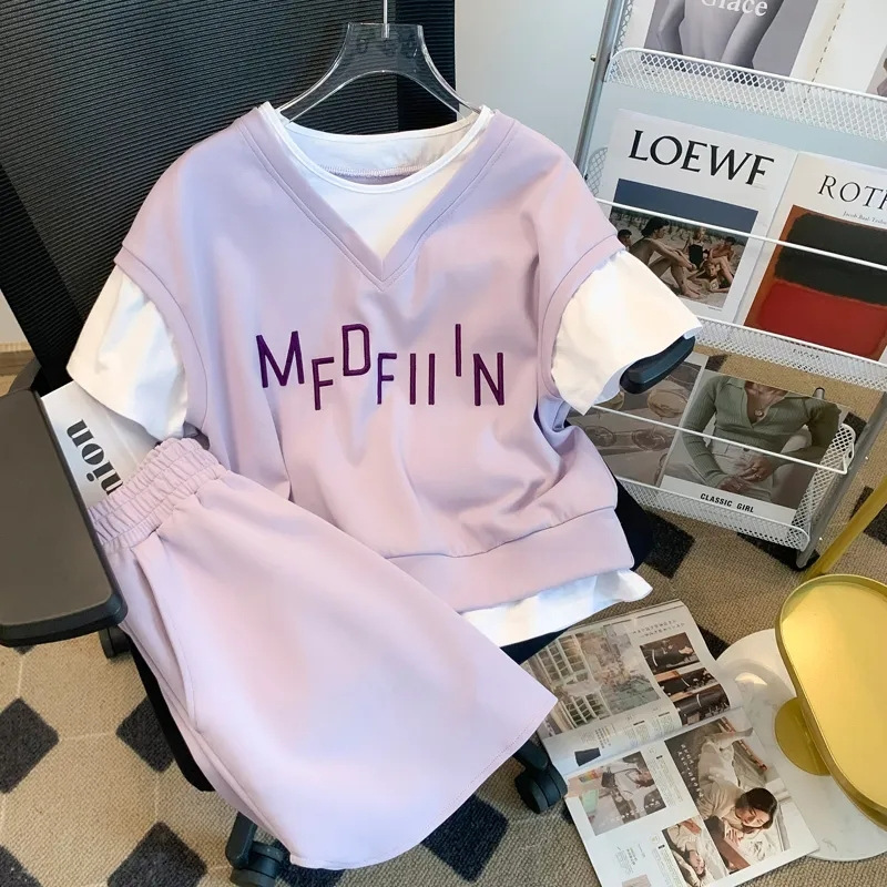 Setelan pakaian dua potong untuk wanita, T-shirt longgar lengan pendek kasual gaya Korea Musim Panas 2024, setelan baru dua potong untuk wanita