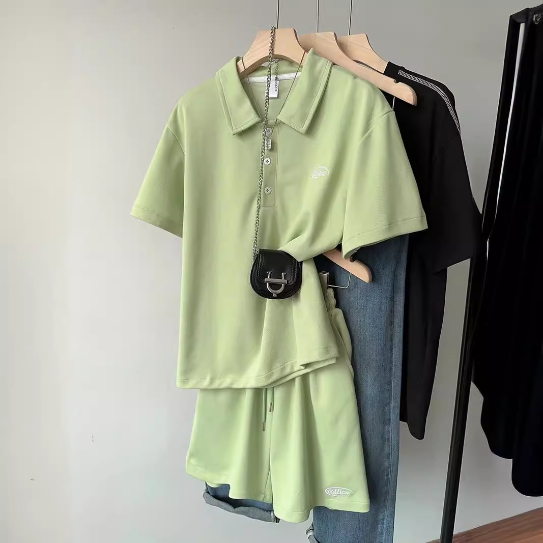 Real shot setelan kasual mutiara wanita, pakaian olahraga ukuran plus untuk pelajar olahraga kerah bordir warna polos musim panas 2023
