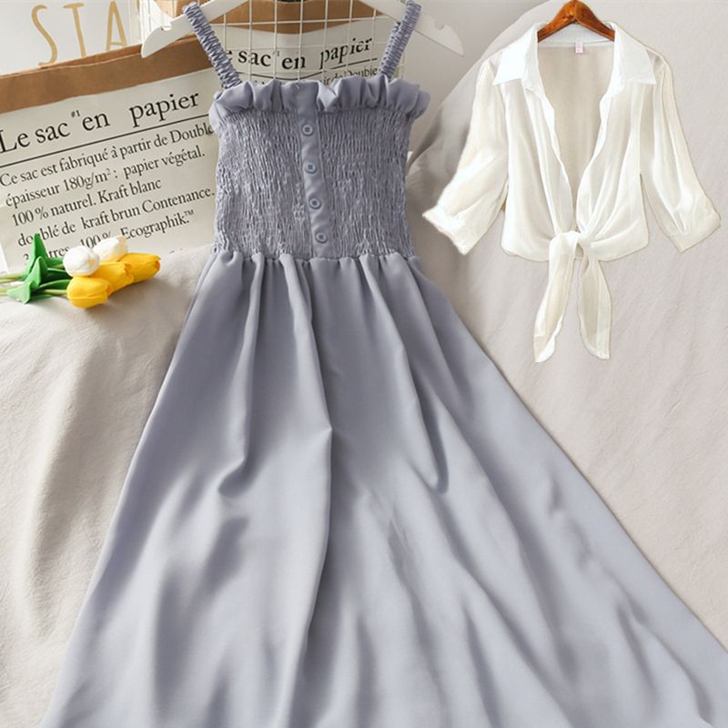 Setelan dua potong mode siswa rok suspender sifon panjang menengah manis peri musim panas gaya Korea baru 2024