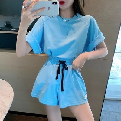 Setelan pakaian olahraga wanita musim panas, celana pendek lengan pendek pelajar longgar bergaya Korea, celana pendek lengan pendek kasual dua potong untuk wanita