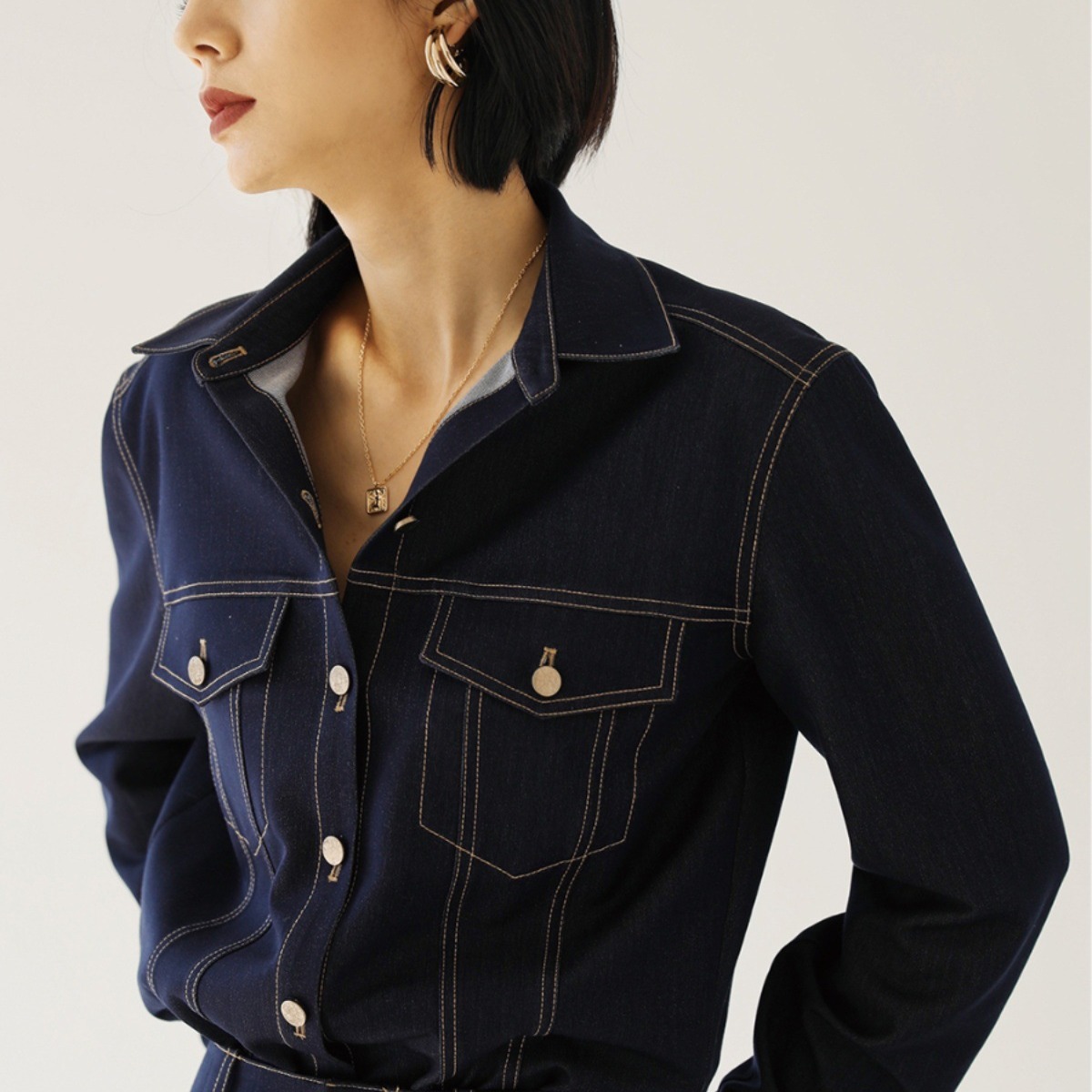 Set atasan dan bawahan denim lebar pinggang tinggi model vintage, bahan denim TR lembut tanpa setrika, jahitan atas, model longgar, koleksi musim gugur 2024.