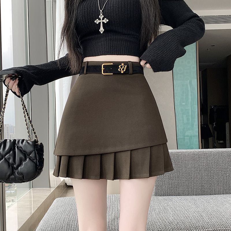 Bidheng rok berlipat wanita, setelan sabuk gaya Korea, rok a-line dekoratif musim gugur 2022