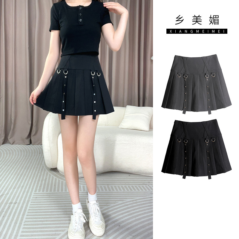 Rok Lipit Rantai Kepribadian Gaya Korea Foto Solid Rok Siswa Ritsleting Sisi Sisi Desain dengan Lapisan Dalam