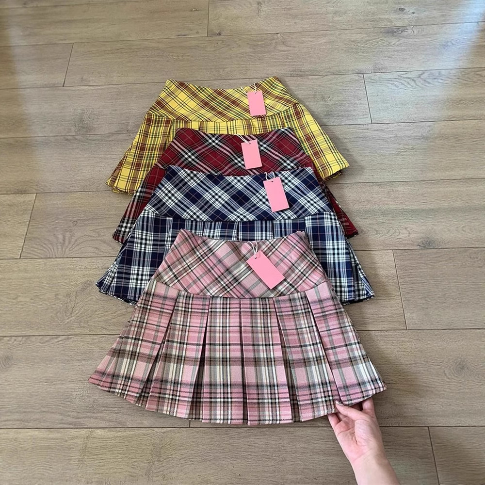 Peri rok a-line pinggang tinggi Jepang musim panas rok kontras baru wanita jk kotak-kotak slim-fit anti-paparan rok lipit 523