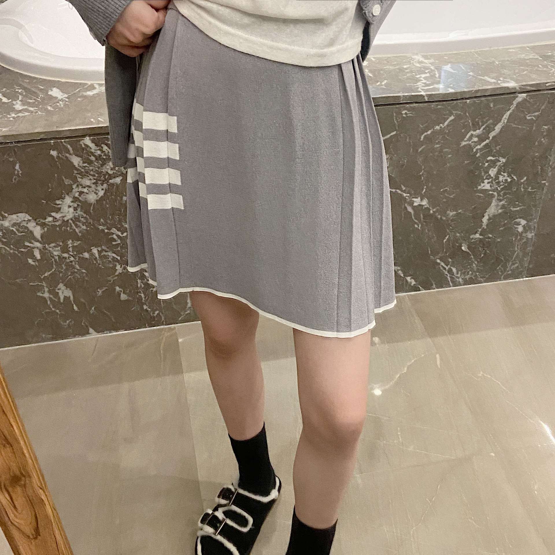 Rok Setengah Badan Abu-abu Kaki Panjang Besar Rok JK Orang Kecil Pinggang Tinggi Musim Semi Rok Pendek Lipit Gaya Sekolahan
