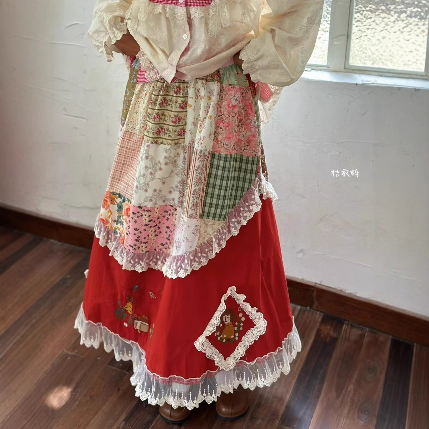 森系复古碎花百家拼布秋季半身裙田园少女松紧腰蕾丝花边拼接森女