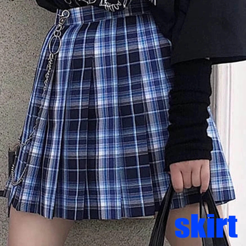 Rok Lipit Setengah Tubuh Model Pendek Mudah Dipadu Padan Kasual JK Kotak-Kotak Warna Biru Segar Gadis Manis Kolese Jepang Pakaian Wanita Grosir
