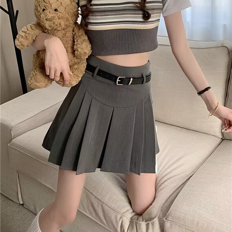 Rok lipit + ikat pinggang, rok seragam JK, rok setengah panjang, rok musim semi, musim panas, musim gugur, musim dingin, ikat pinggang, rok pendek, rok wanita trendi