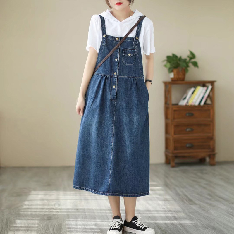 Rok suspender Denim 2024, gaun rompi longgar gaya Korea mahasiswa mahasiswa mode dicuci katun baru Musim Semi dan Gugur