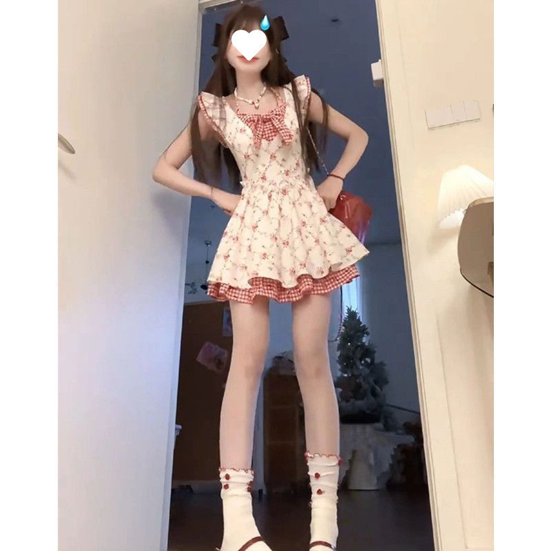 Gaun Sling musim panas baru 2023 rok kecil ramping pelajar Super peri longgar gaya Korea bunga kecil