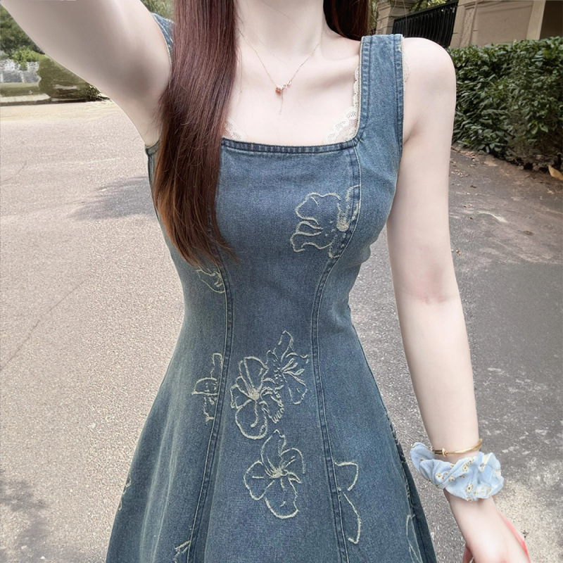 Gaun Tank-Top Tanpa Lengan Motif Denim Retro Gaya Tiongkok Baru Rok A-Line Terlihat Langsing Pinggang Membentuk Pinggang Sambungan Gaya Cina Siswa Wanita