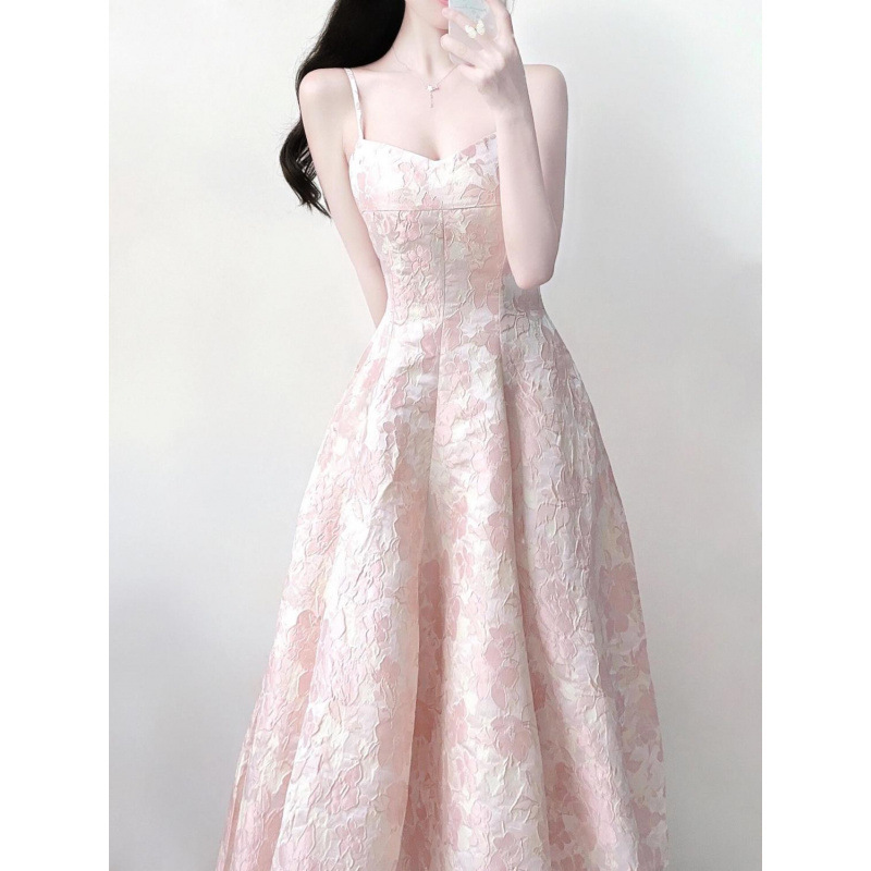 Gaun Suspender Elegan Gaya Prancis Rok Sentuhan Wanita Gaun Model Baru Musim Panas Rok Panjang Liburan Terlihat Langsing