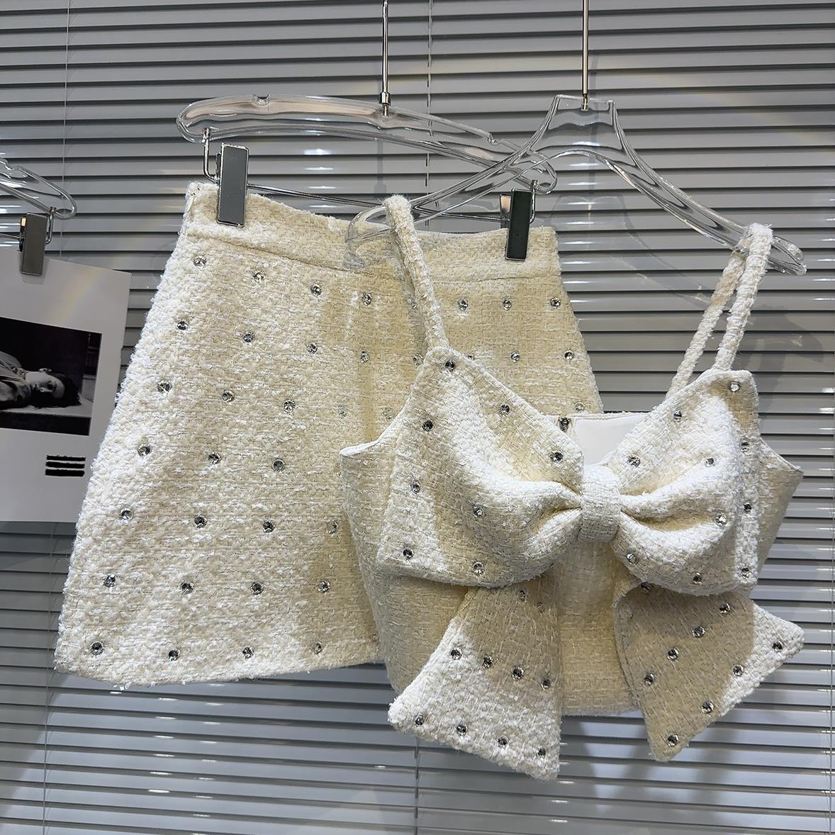 Internet selebriti gaya yang sama 2023 musim dingin gaya channel baru berlian imitasi kupu-kupu besar kamisol + rok wol setelan