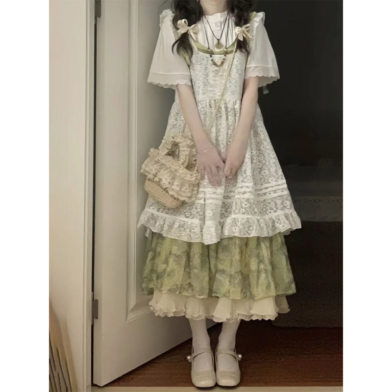 Rok Sling Bunga Retro Pria Kecil Gaya Sekolah Mori Kemeja Lengan Pendek Rok Renda Kemeja Siswa Wanita Set Tiga Potong