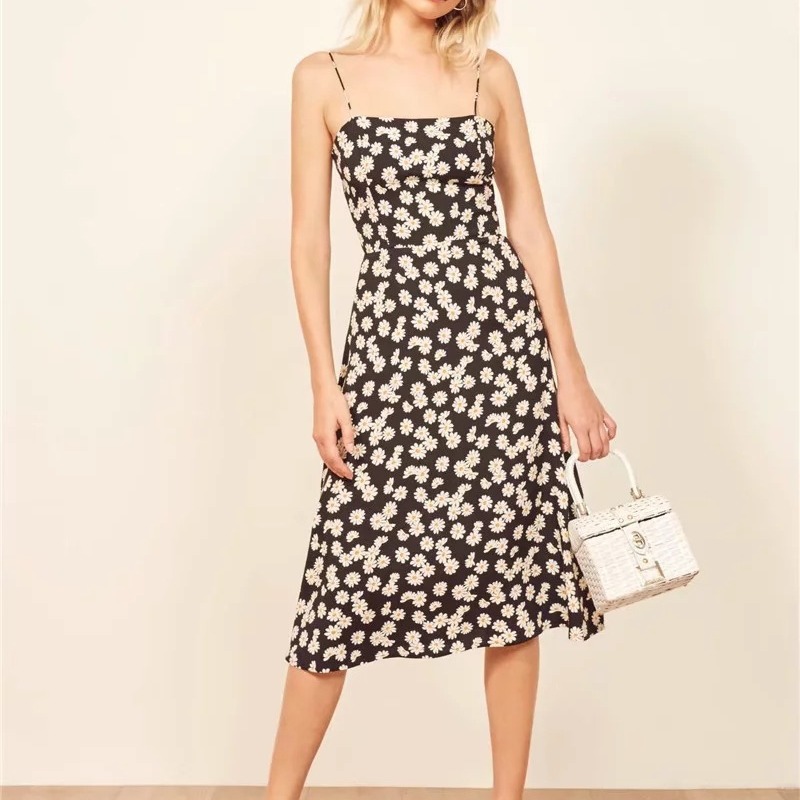 Busana musim semi dan musim panas gaun bertali pinggang tinggi rok motif penjualan laris Eropa dan Amerika pengiriman langsung dari pabrik satu bagian