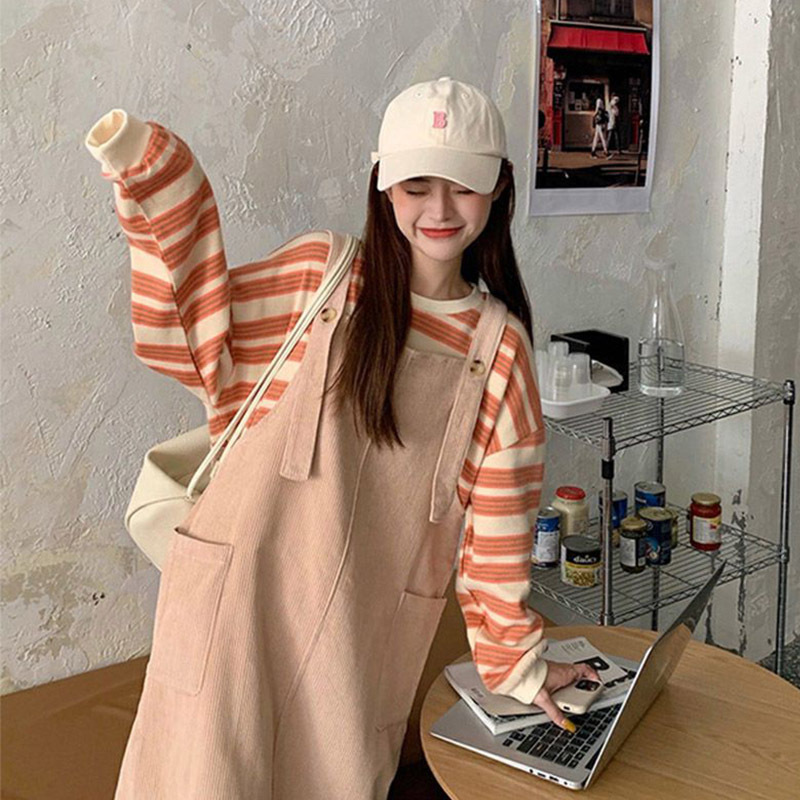 Setelan sweter bergaris wanita, mantel tipis longgar + gaun suspender corduroy, setelan pakaian siswa dua potong