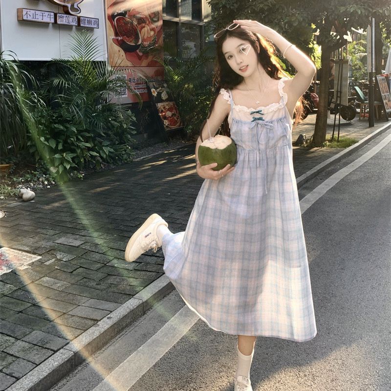 Gaun Kotak-Kotak Gadis Gaya Garam Gaun Tali Elegan Musim Panas Dua Potong Palsu 2025 Rok A-Line Manis Murid Anak-anak