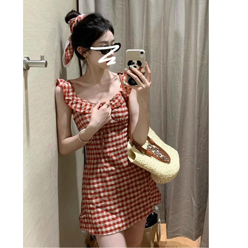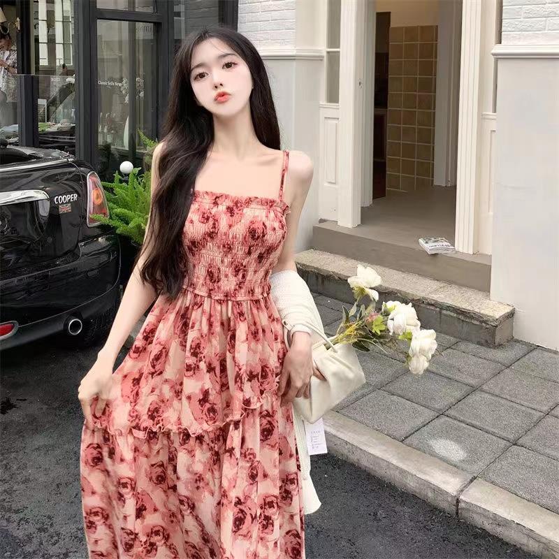 Gaun Suspender Bunga Musim Panas Wanita Rok Pendek Menutupi Pinggul A-Line Siswa Gaya Desain Membentuk Tubuh Seksi Manis dan Pedas Murni Musim Panas