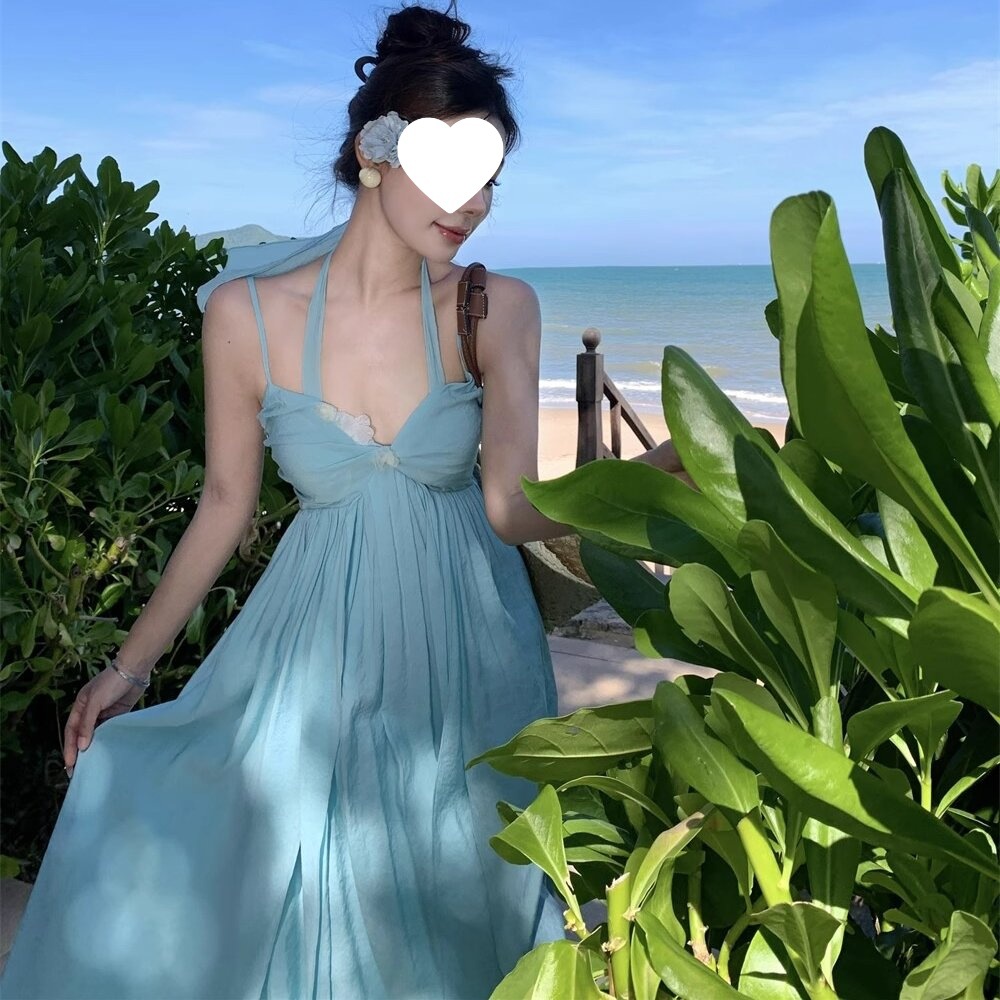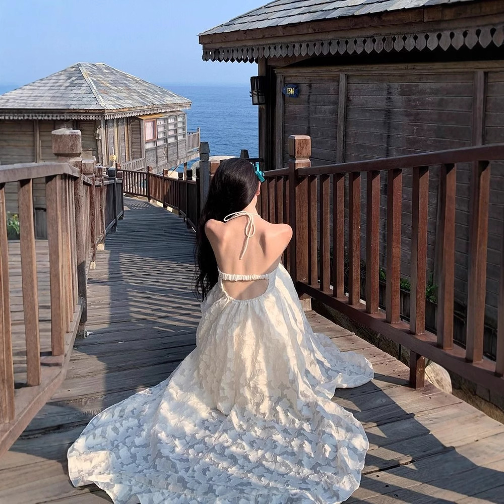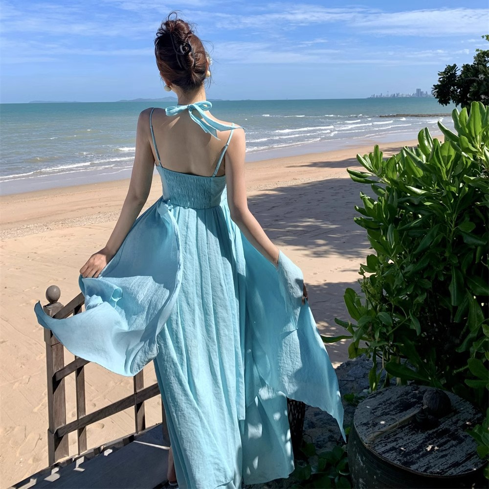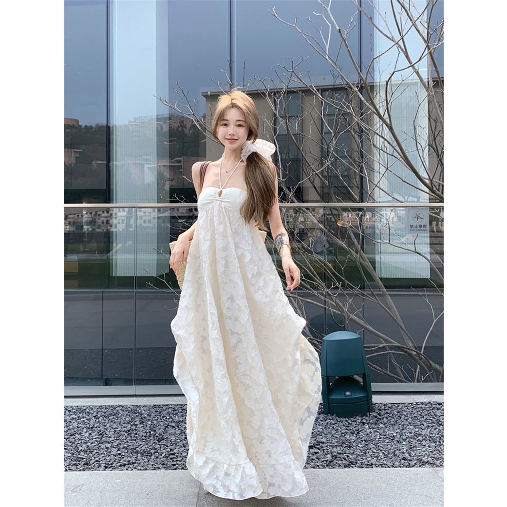 Gaun Tali Gantung Leher Liburan Pantai Gaya Perancis Murni Rok Panjang Wanita Elegan Punggung Terbuka Seksi Musim Panas 2025