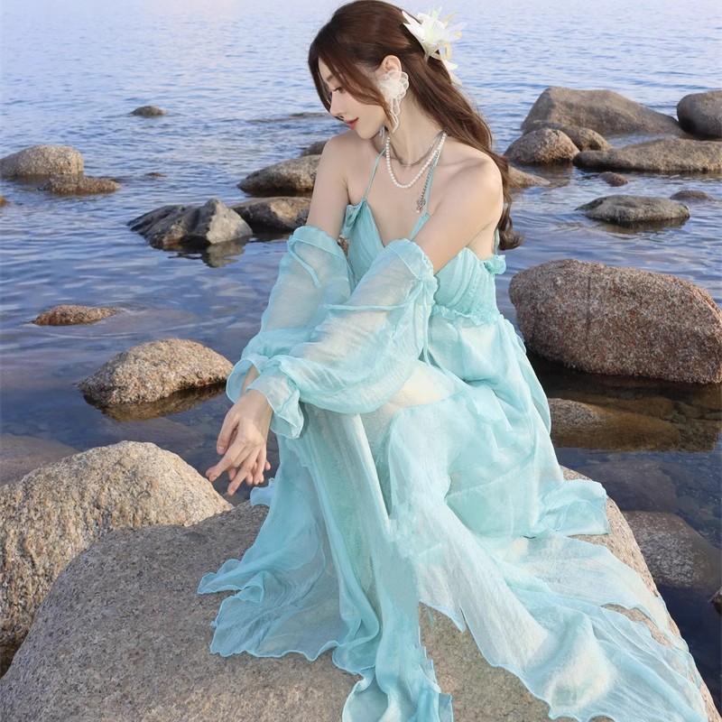 Rok Pantai Suasana Liburan Tepi Laut Hijau Mint Rok Panjang Suspender Punggung Terbuka Elegan Gantung Leher Gaya Desain