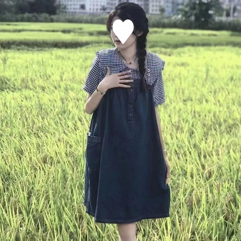 Gaun Saku Denim Saku Besar Berukuran Besar Bergaya Retro Kemeja Kerah Boneka Murid Sekolah Setelan Dua Potong
